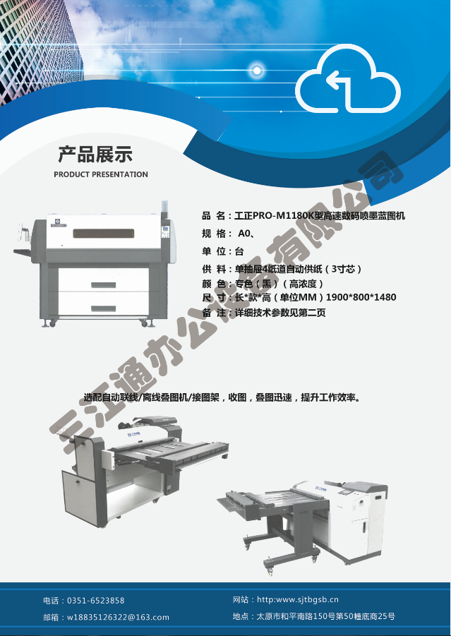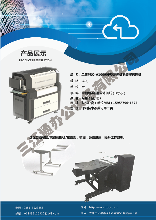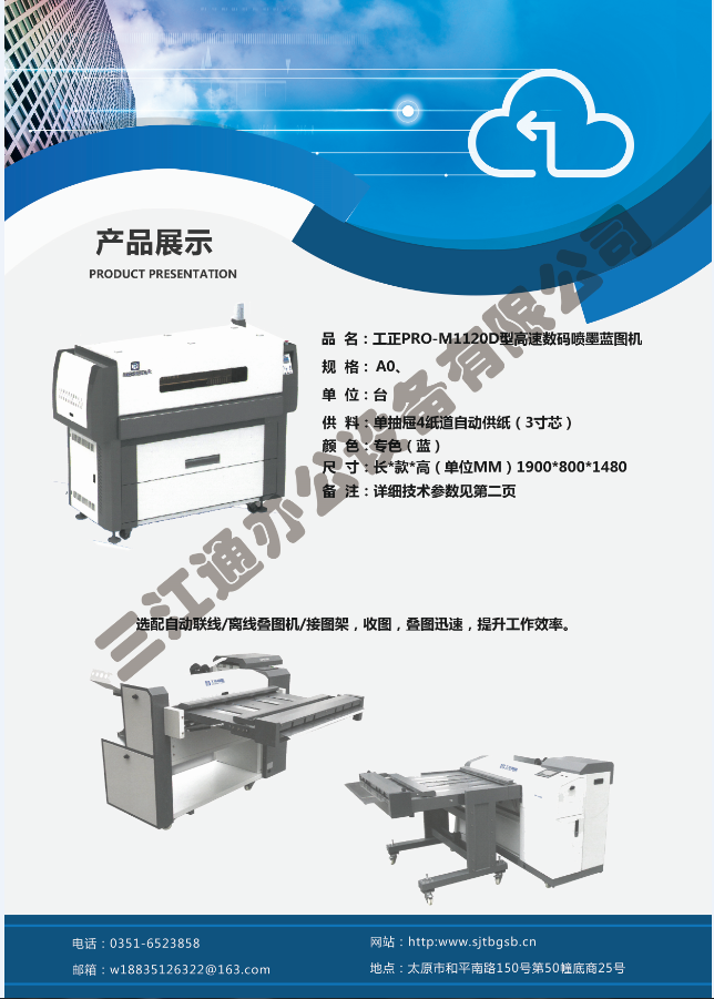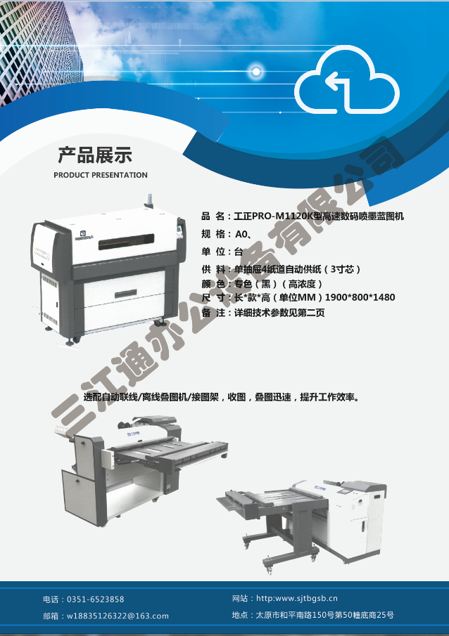 太原市三江通辦公設備有限公司是一家專業(yè)從事曬圖機、數(shù)碼復印機、多功能打印、復印、掃描、縮放一體機、模擬工程復印機、繪圖儀、大型掃描儀、電子歸檔設備、手動、自動成形圖紙檔案密集柜、圖前圖后設備以及所有制圖設備耗材供應、維修一條龍的實體企業(yè)。多年來,已與日本、北京、天津、上海、杭州等諸多家廠方多方合作,成為山西>>更多